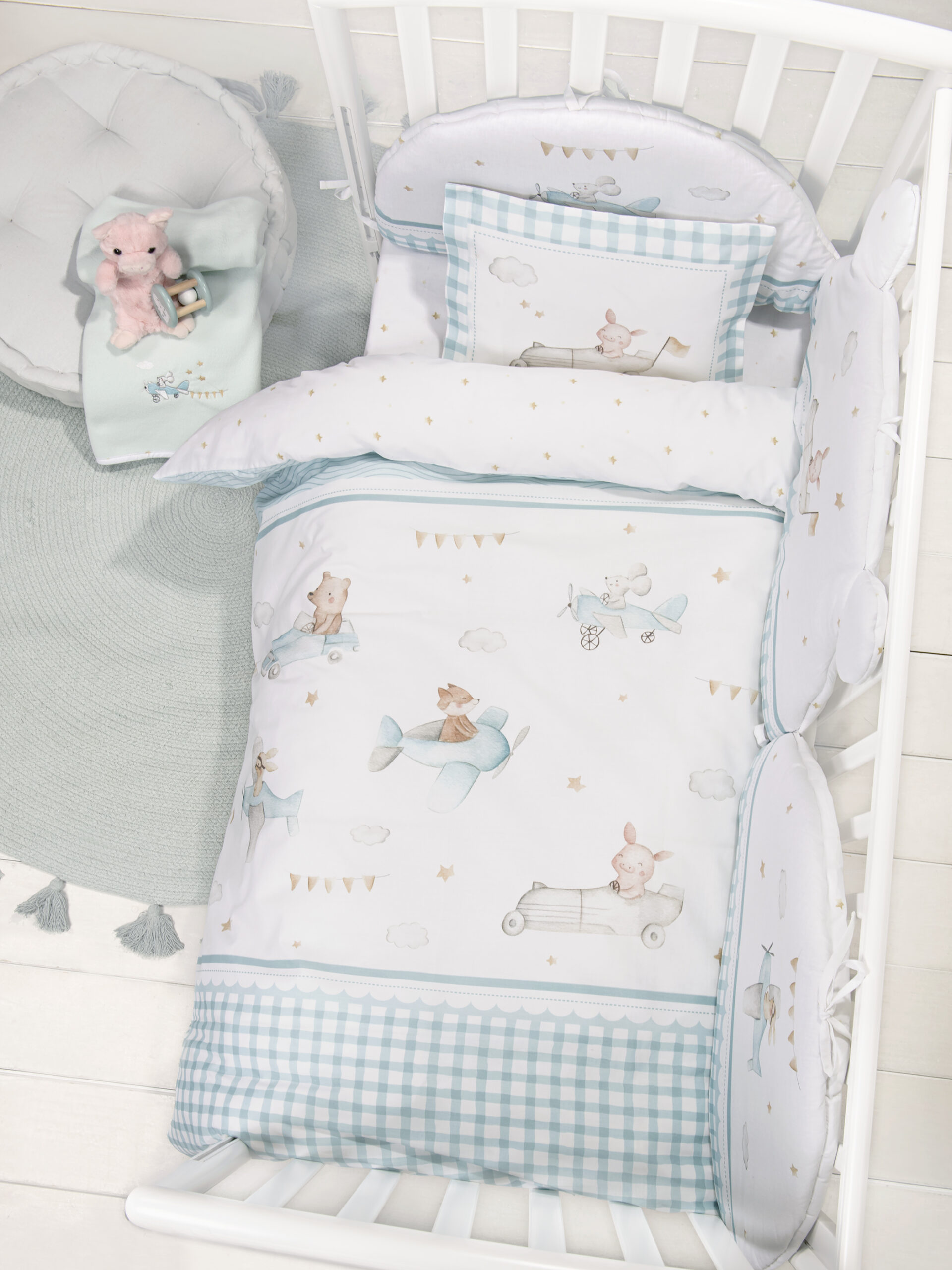 Η συσκευασία περιέχει: Nima Bebe Σετ Παπλωματοθήκη Κούνιας – Joy Ride Λευκό, Γαλάζιο 100% Cotton, 144 T.C.