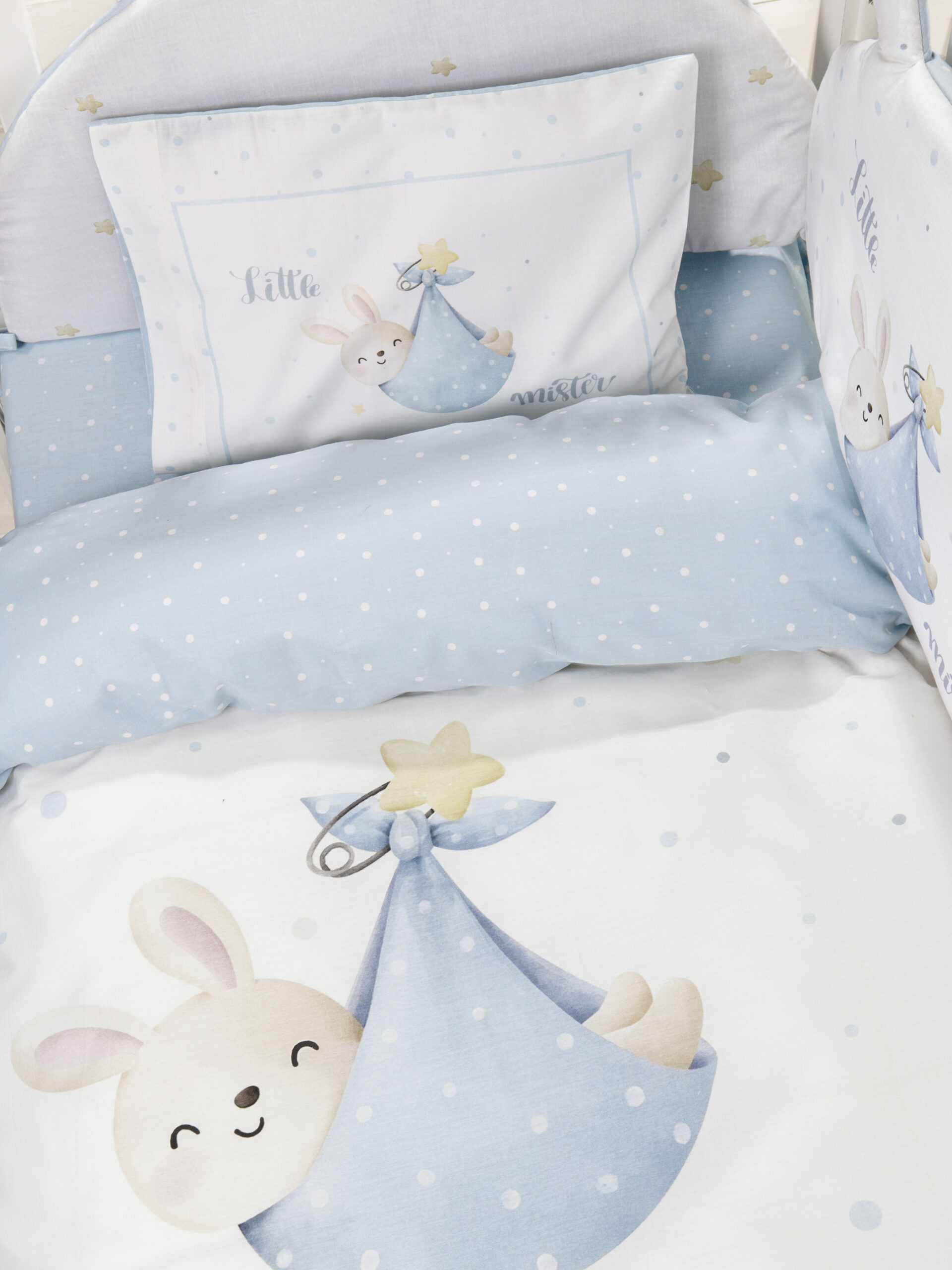 Η συσκευασία περιέχει: Nima Bebe Σετ Παπλωματοθήκη Κούνιας – Little Mister Λευκό, Γαλάζιο 100% Cotton, 144 T.C.