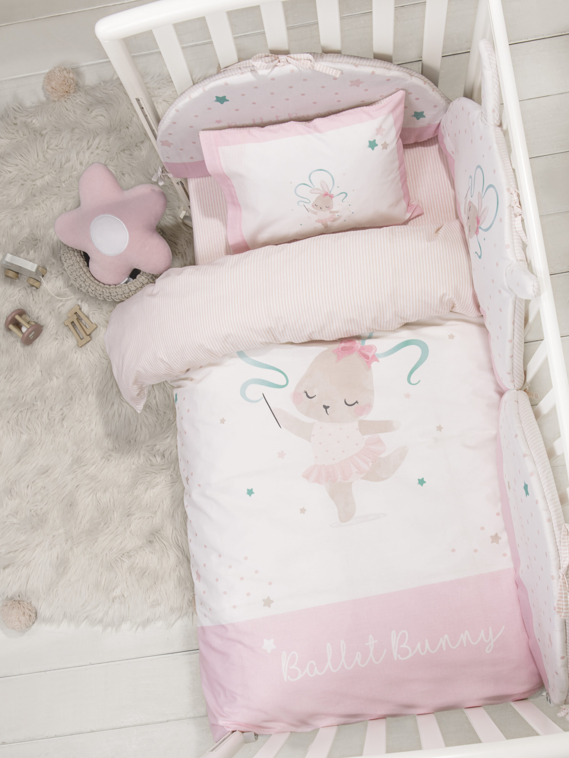 Η συσκευασία περιέχει: Nima Bebe Σετ Σεντόνια Κούνιας – Ballet Bunny Λευκό, Ροζ 100% Cotton, 144 T.C.