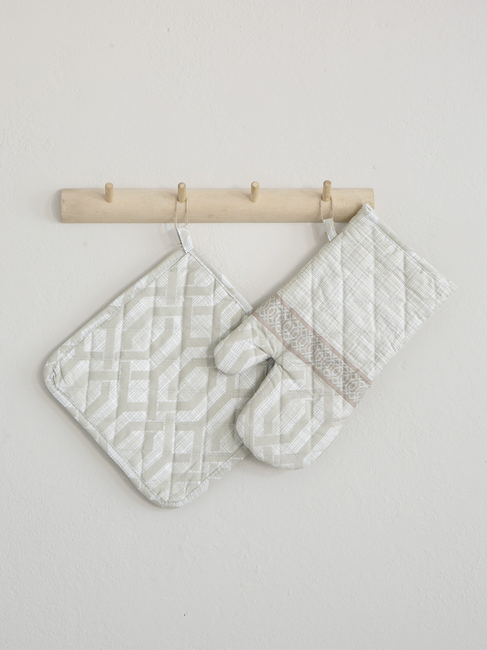 Η συσκευασία περιέχει: Nima Home Σετ Κουζίνας (Γάντι + Πιάστρα) – Casablanca Λιλά, Ροζ, Λευκό 100% Cotton