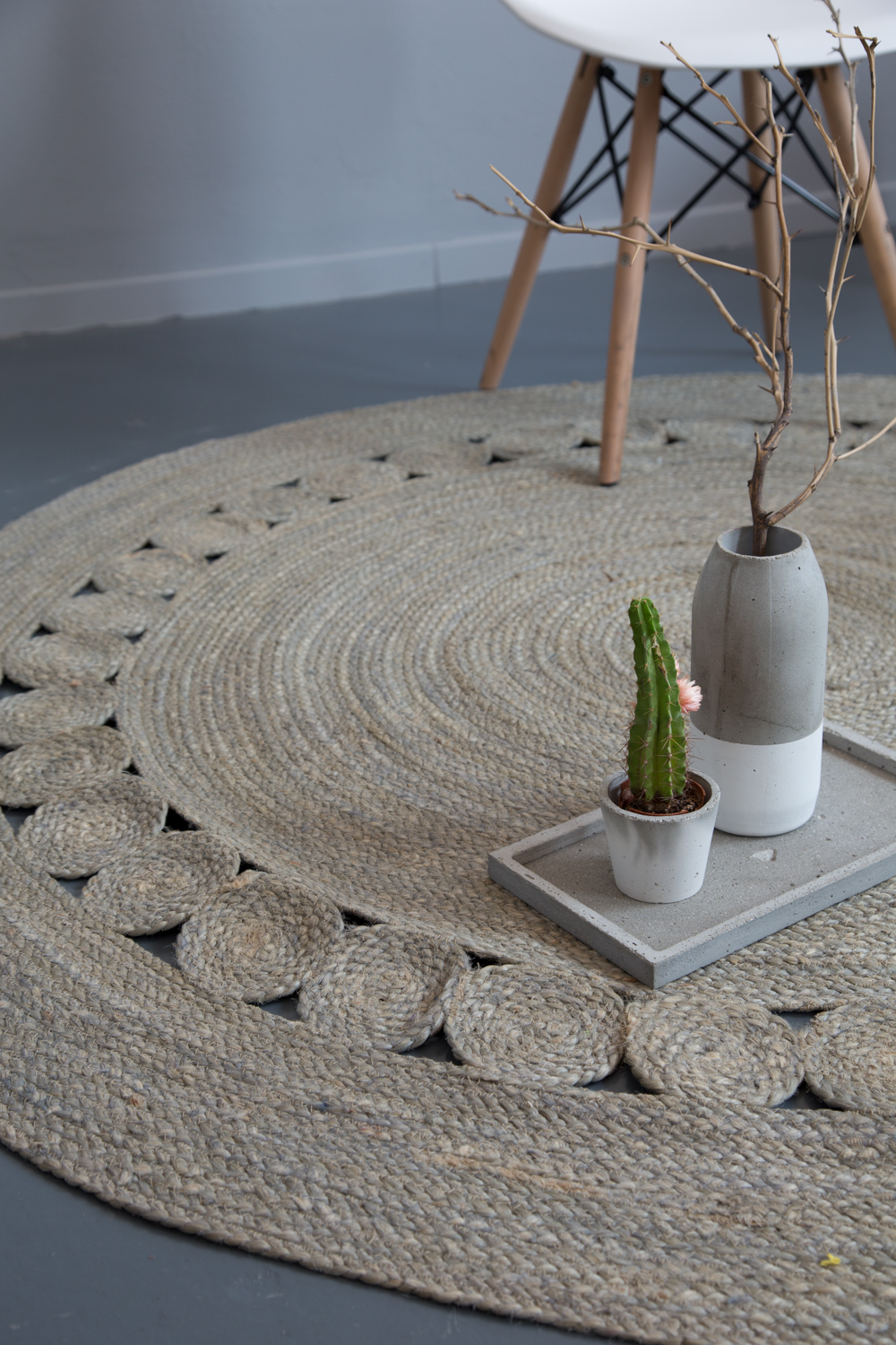 Η συσκευασία περιέχει: Nima Home Στρογγυλό Χαλί R150 – Makrame Light Gray Γκρι 100% Jute